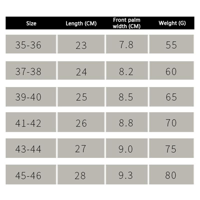 Size 45-46: Length: 28cm, Forefoot width: 9.3cm, Weight: 80g