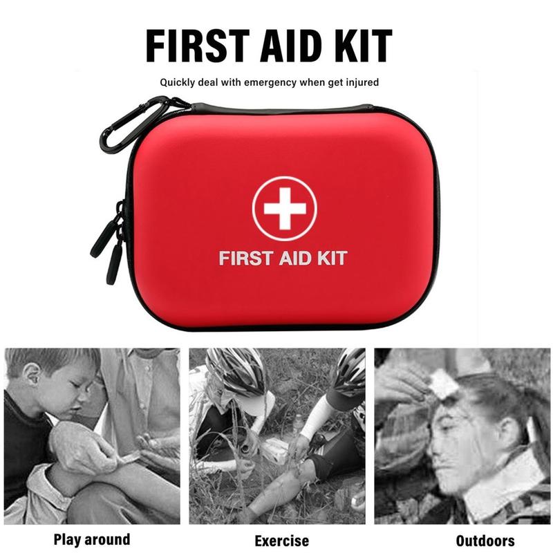 This extraordinary first aid kit contains 1 eye pad, 20 standard and 10 small adhesive bandages, 2 drum adhesive bandages, 10 alcohol prep pads, 4 wet wipes, 20 cotton swabs, 1 CPR breathing mask, 1 PBT bandage, 2 Lodine pads, 1 triangular bandage, 1 pair of PVC gloves (size L), 1 wear-resistant pad, 2 burn creams, 1 tape, 1 tourniquet, 4 gauze swabs, 1 tweezer, 1 whistle, 5 pins, 1 scissors, 2 Itching pads, 1 soap flake and 1 bag.