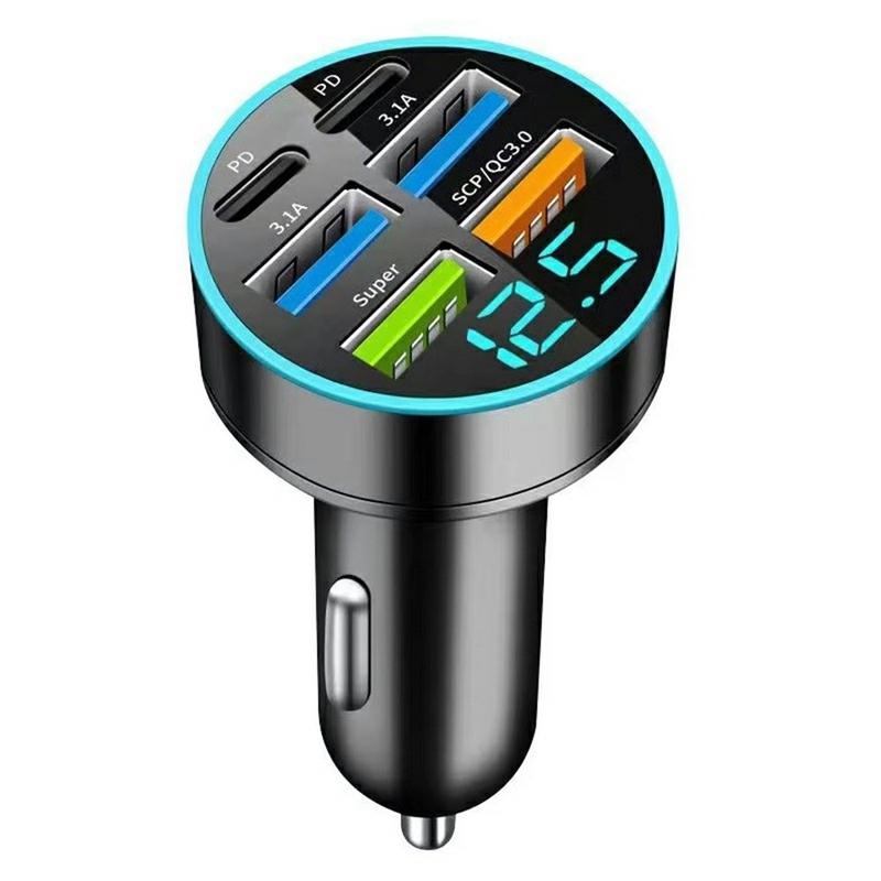 100W 6-Port Car Charger - PD & QC3.0 Fast Charging Adapter with Voltage Display