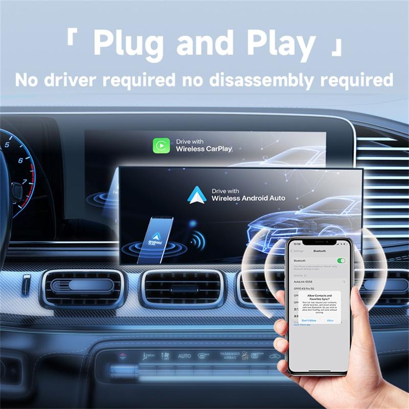 Upgrade your driving experience with the 2-in-1 Wireless CarPlay & Android Auto Adapter. This compact USB dongle effortlessly converts your wired CarPlay or Android Auto system into a wireless connection, ensuring a cord-free and hassle-free experience. Simply plug & play into your car’s USB port and enjoy Bluetooth & WiFi connectivity for uninterrupted access to navigation, calls, music, and more.