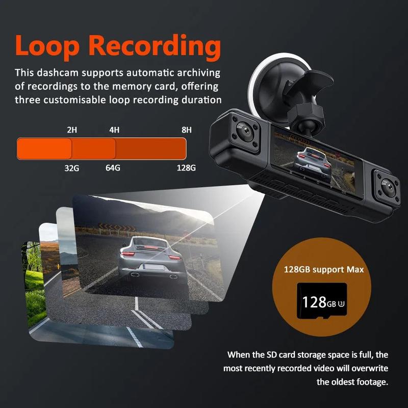 Stay safe and fully protected on the road with this 3.0" IPS Screen 4-lens dash cam, designed to record your journey with exceptional clarity. Featuring a 1080P front camera and three additional 480P side and rear lenses, it provides complete all-round coverage for a safer and more confident driving experience.