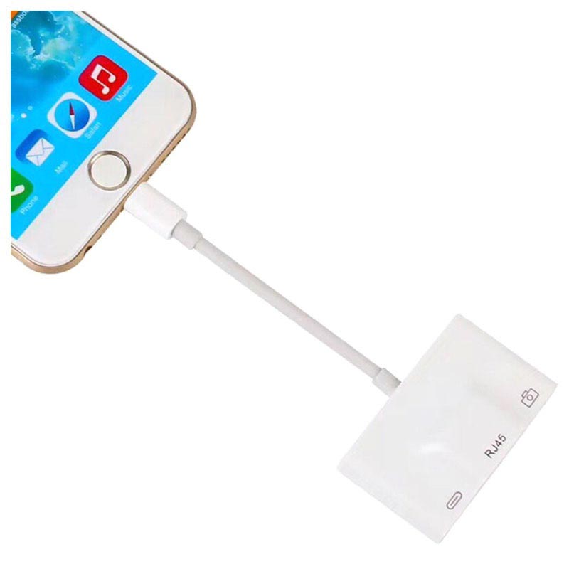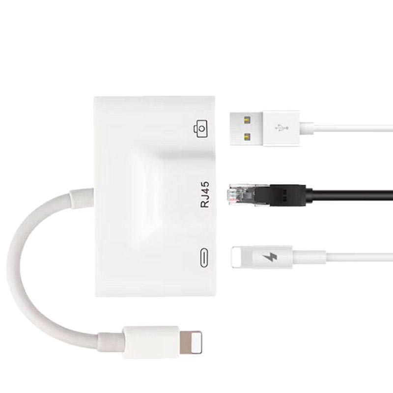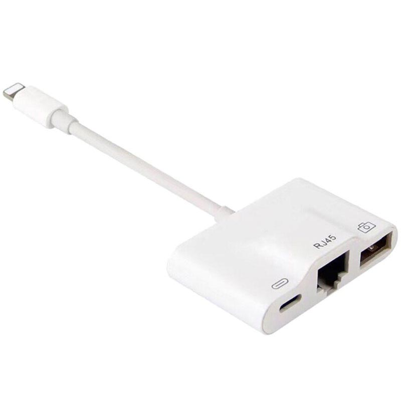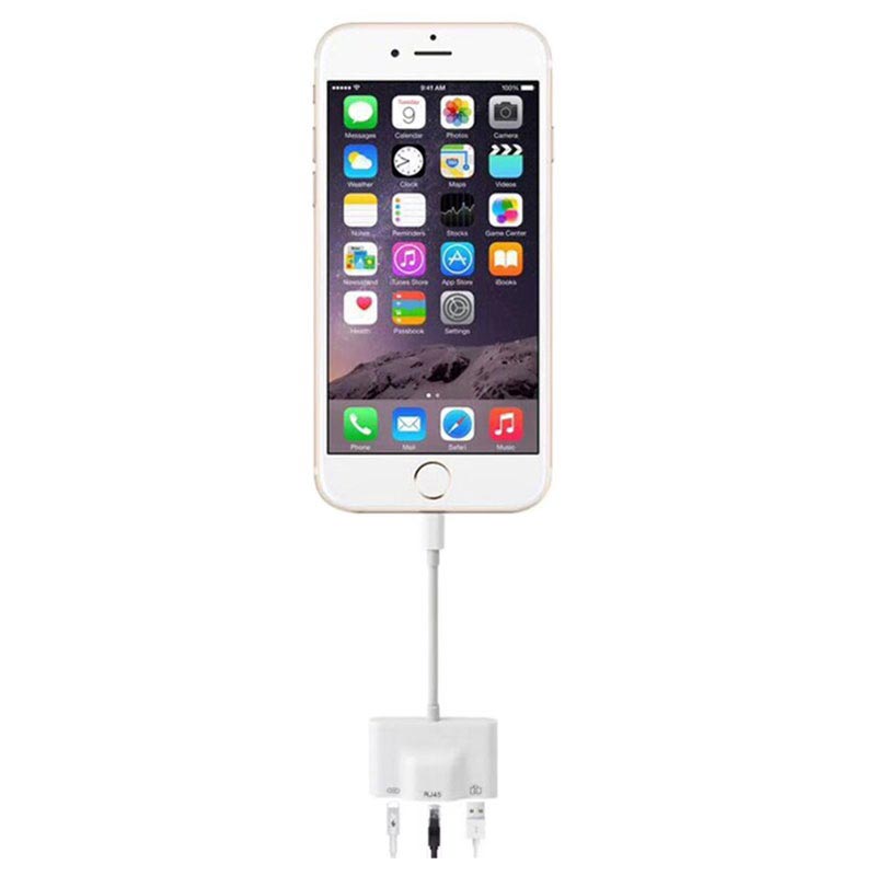 This multifunctional 3-in-1 lightning cable adapter features an RJ45 Ethernet LAN network port, a USB 2.0 port and an 8-pin lightning port with pass-through charging. The adapter supports 10/100 Mbps internet connectivity, and it's compatible with all 8-pin Apple iPhones and iPads that run at iOS 10 or newer.