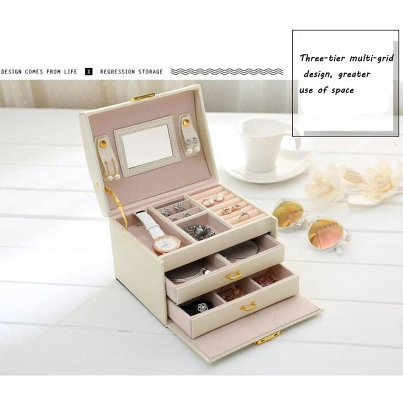 Multi-functional jewelry case with storage drawers, classifies necklaces, bracelets, watches, earrings, ear studs, hairpins, brooches and other jewelries in perfect order