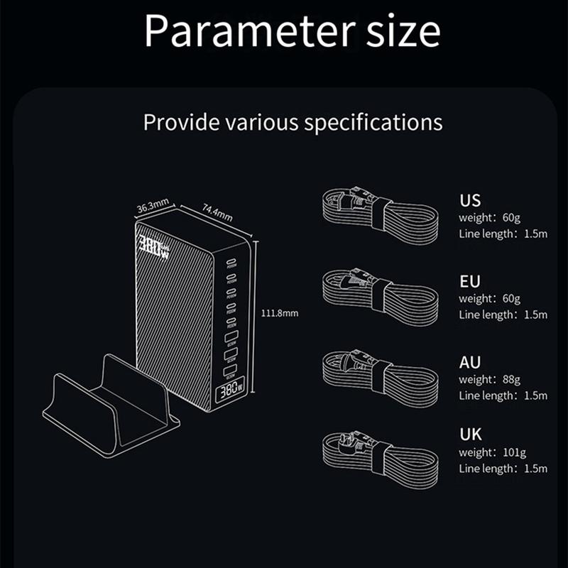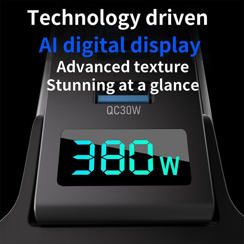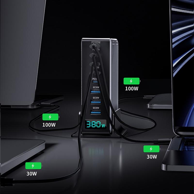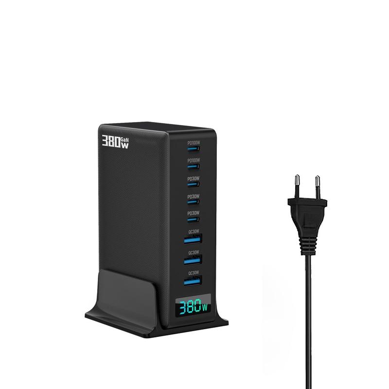 Power up your whole setup with a high-output 380W GaN desktop charging station built for modern homes and offices. With 8 ports (5x USB-C + 3x USB-A) and a digital power display, you can charge laptops, phones, tablets, headphones, power banks, and more at the same time—while keeping your desk clean and organized. GaN technology helps deliver strong performance in a compact form, and built-in safety protections help keep charging stable and reliable.