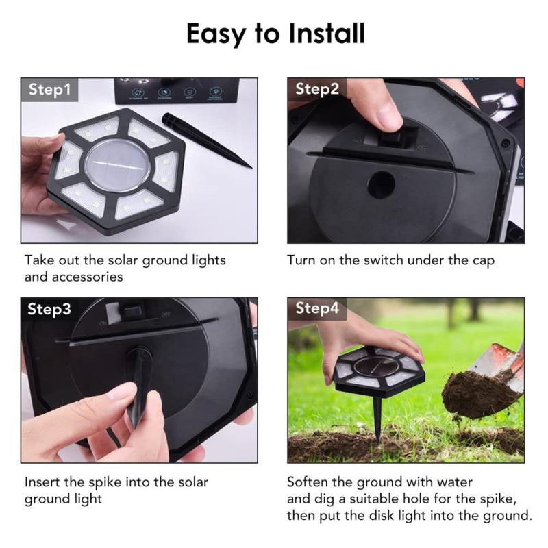 Brighten paths, lawns and patios with four low-profile solar ground lights. Each unit uses a polycrystalline panel to charge by day and auto-illuminate at night, delivering clean, cable-free white light for safer, smarter outdoor spaces.