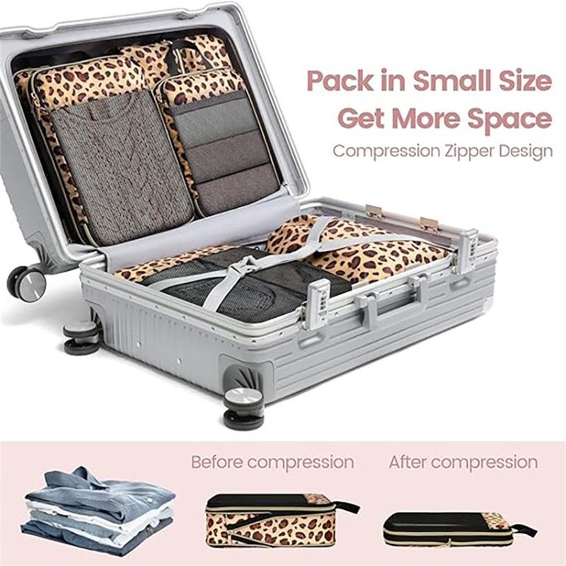 6-Piece Leopard Print Travel Organizer Set - Space-Saving Compression Bags for Clothes & Toiletries