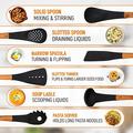- Complete 7-Piece Cooking Collection - Includes all your kitchen essentials: soup ladle, slotted spoon, solid spoon, slotted spatula, solid spatula, pasta server, and a matching storage stand.