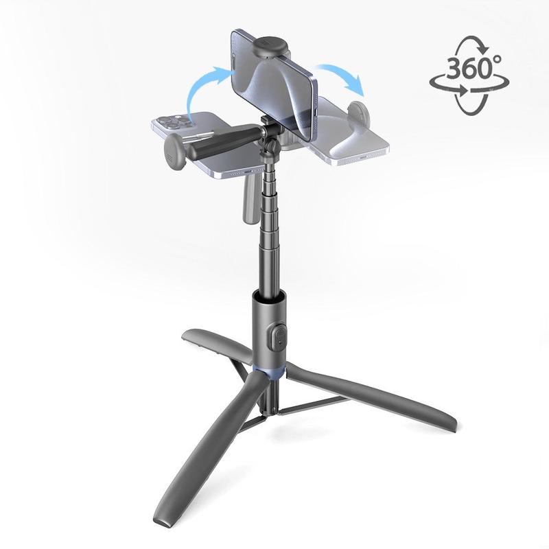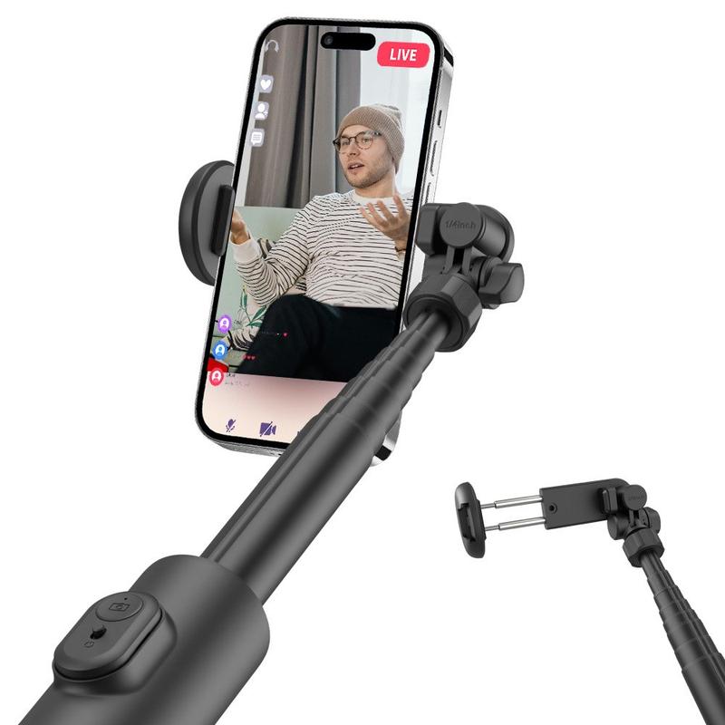 Most selfie sticks top out at one metre or wobble when fully extended; the T02 balances true tripod stability, 3 kg payload capacity and a travel-ready 0.34 kg weight. All-in-one design means no extra phone clamp or remote to lose—just unfold, pair and shoot.