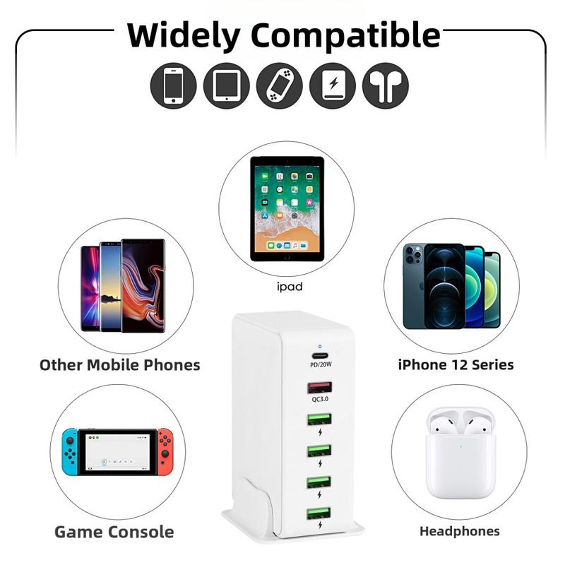 With one PD port, one QC3.0 port, and four additional USB-A outputs, you can charge several devices simultaneously — perfect for workstations, families, or travellers who carry multiple gadgets.