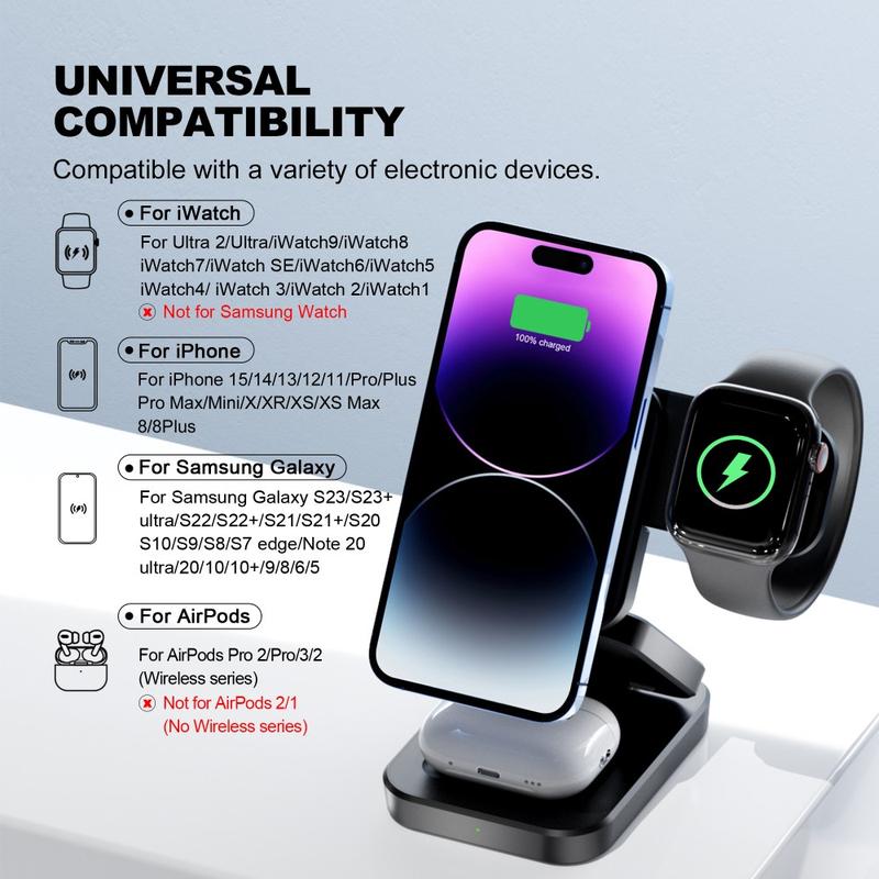 - 3-in-1 Wireless Charging – Supports simultaneous charging of smartphones, Apple Watch, and AirPods, keeping all your devices ready to use