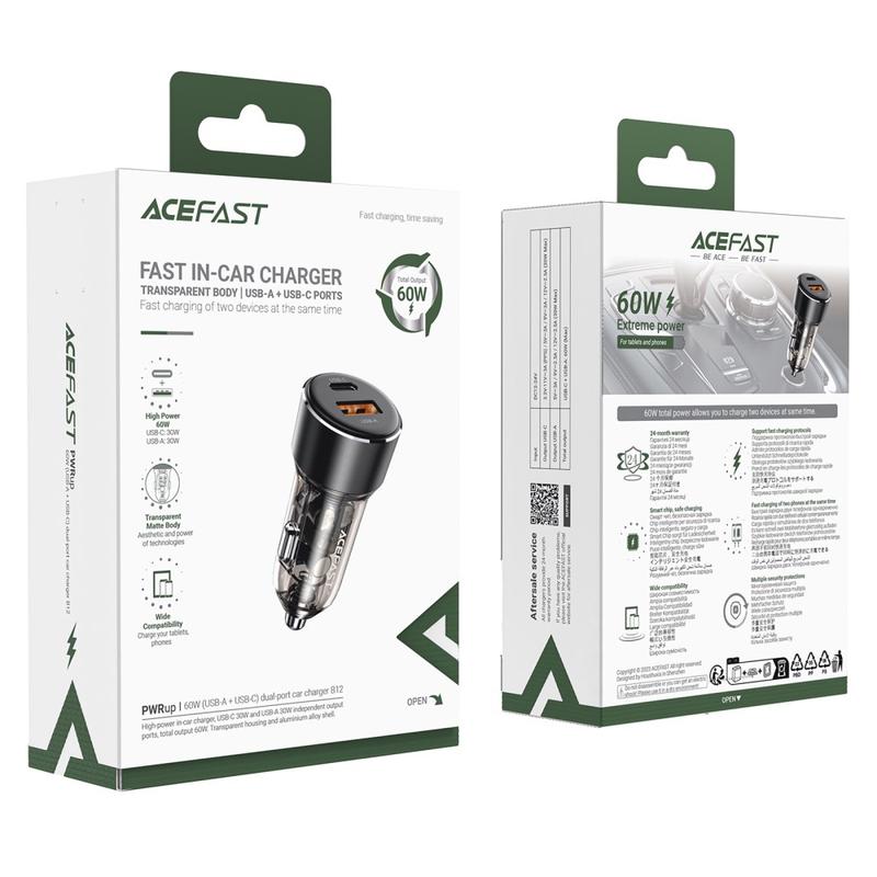 ACEFAST B12 60W USB-A+Type-C Car Charger Cigarette Lighter Phone Fast Charging Adapter