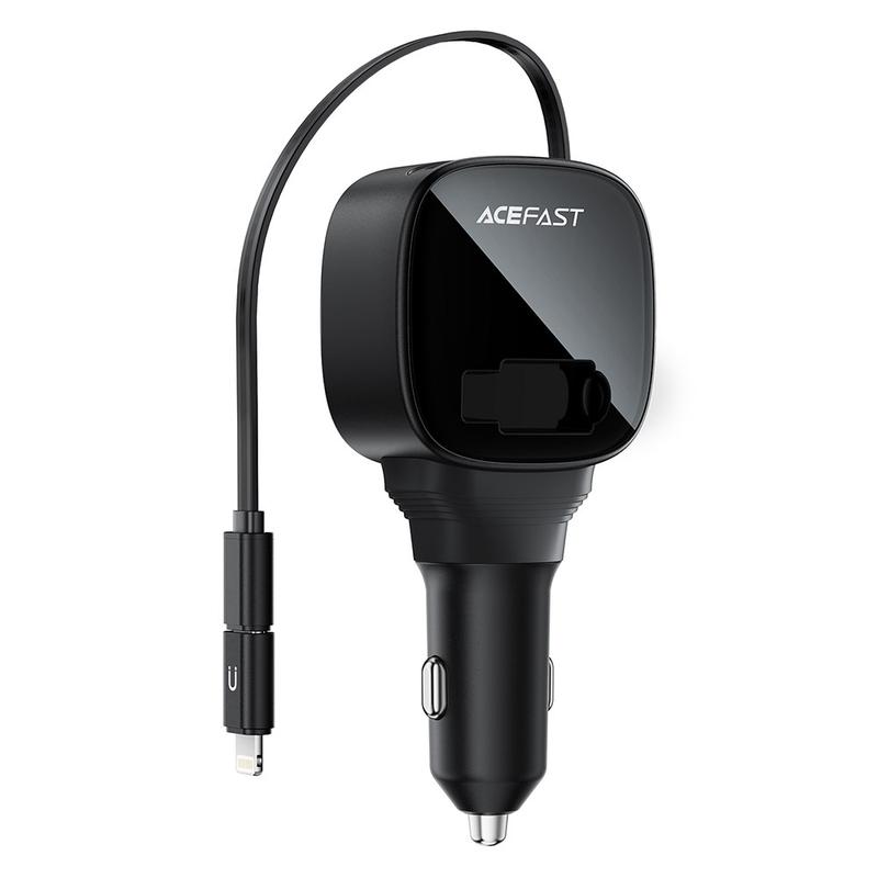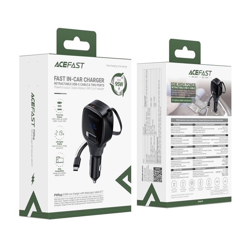 The ACEFAST B17 95W car charger delivers powerful, efficient and clutter-free charging for modern devices on the go. With its built-in retractable USB-C cable, additional USB-C and USB-A ports and clear LED digital display, this charger provides a premium charging experience for drivers who rely on fast, stable power. Its sleek ice-blue lighting adds a modern touch to any vehicle interior while wide protocol compatibility ensures support for a broad range of phones, tablets and accessories.