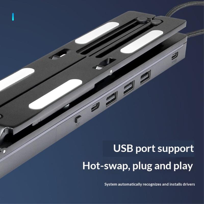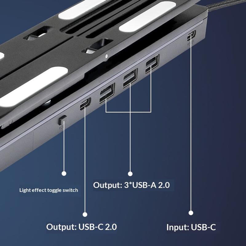 The built-in USB hub includes 4 ports: 3 × USB-A 2.0 and 1 × USB-C 2.0. It supports hot-swapping and plug-and-play use, allowing you to connect peripherals such as a mouse, keyboard, USB drive or charging cable directly through the stand.