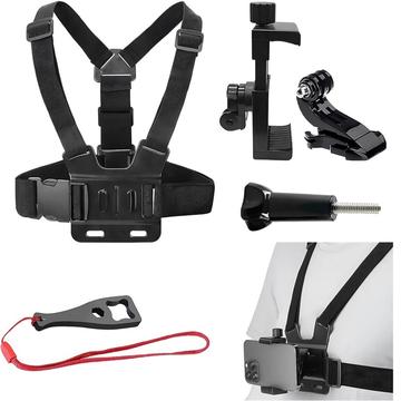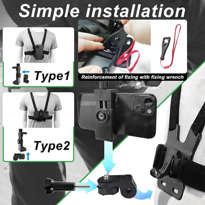 Action Camera Chest Strap Mount - Adjustable Harness with Rotating Phone Clip, J-Base and Wrench
