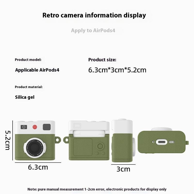 Protect your AirPods 4 in style with this retro camera design case. Made from premium liquid silicone, it offers a soft grip and full protection against drops and scratches. This durable case is washable, ensuring long-lasting use. With both wired and wireless charging support, it provides flexible charging solutions. The included carabiner adds portability, letting you securely attach your earbuds case to your bag or belt, making it ideal for on-the-go use.