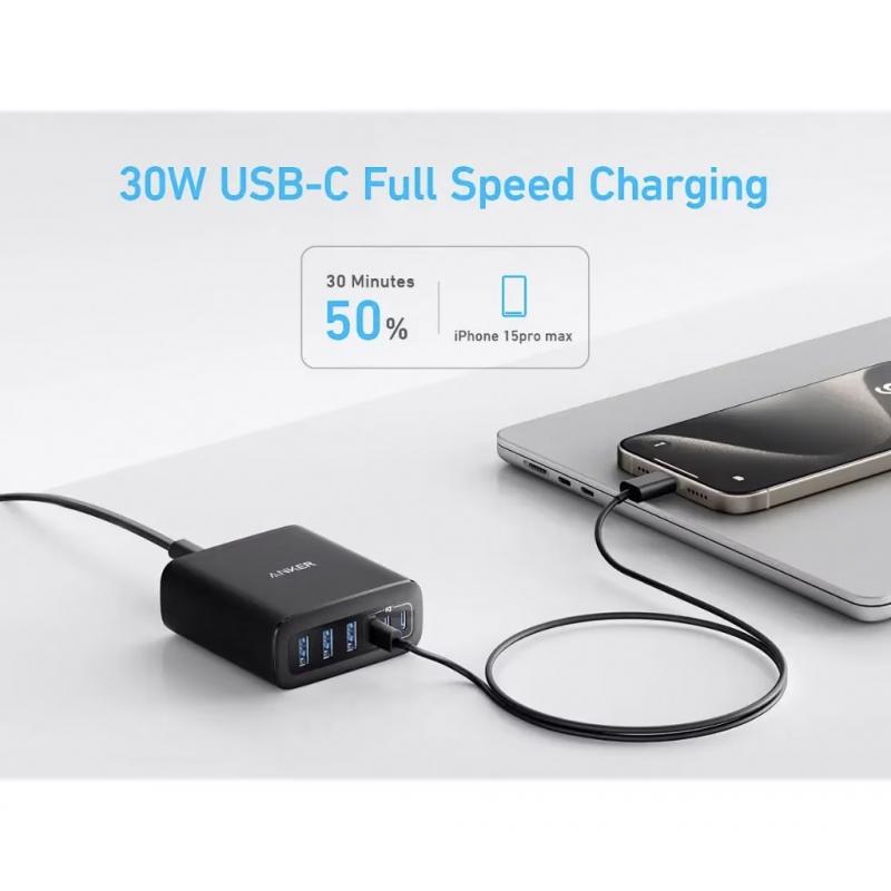 Traditional multi-port adapters often throttle when fully loaded. Anker’s PowerIQ algorithm maintains 30 W on USB-C1 even when every socket is occupied, ensuring critical equipment charges at expected speed. The vertical format clears desk space, and the supplied silicone organiser keeps excess cable length under control.