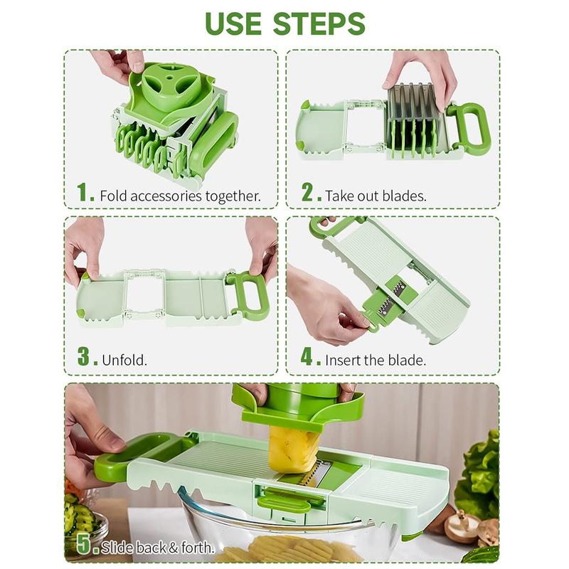 Designed with user safety in mind, the included food holder keeps your hands protected during operation. Made from BPA-free, food-grade materials, this slicer meets both FDA and LFGB standards for safe kitchen use. Its compact, foldable design allows for convenient storage, making it a perfect fit for any home kitchen.