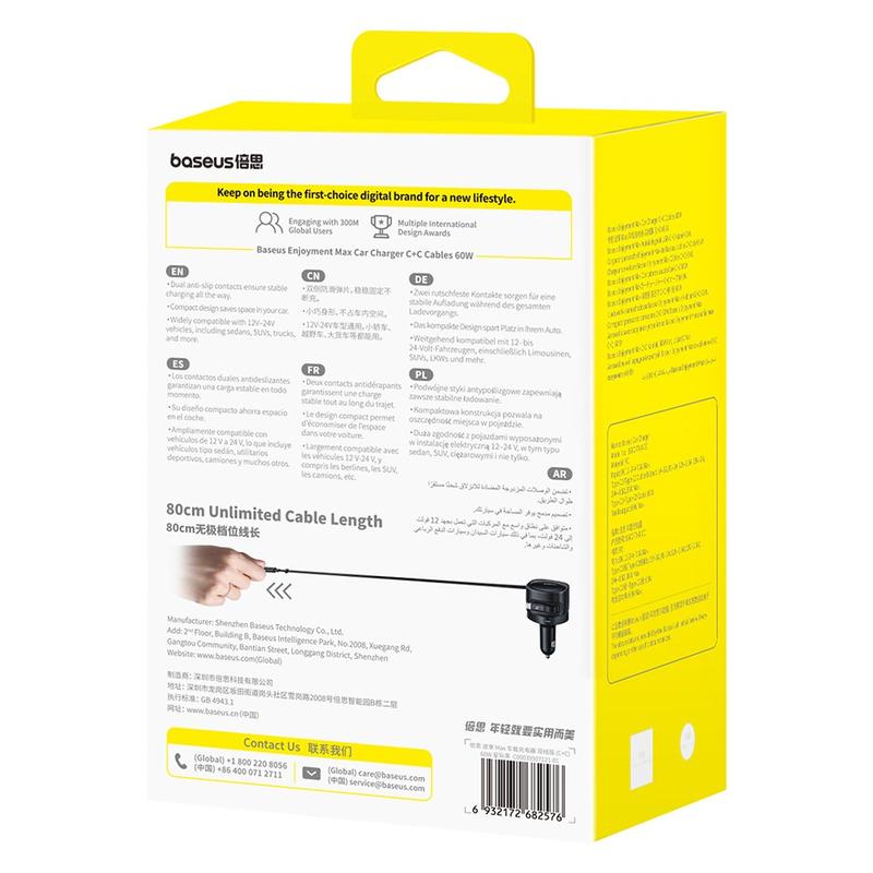 The Baseus Enjoyment Max Car Charger delivers powerful 60W fast charging with dual Type-C retractable cables, ensuring maximum convenience on the go. Its innovative rotatable design allows for easy use in any car layout, while the retractable cables prevent clutter. Compatible with multiple devices, this charger is ideal for busy professionals and frequent travelers looking for efficient charging solutions.