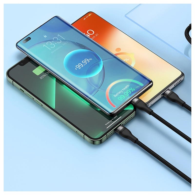 Fast charge up to three devices simultaneously (Lightning, Type-C, microUSB) thanks to the Baseus Flash Series II quality braided cable. Various connectors enable the wide charging range of smartphones, tablets, and laptops, distributing power according to their needs. Check the fast charge status on a LED indicator, and don't worry about overheating.