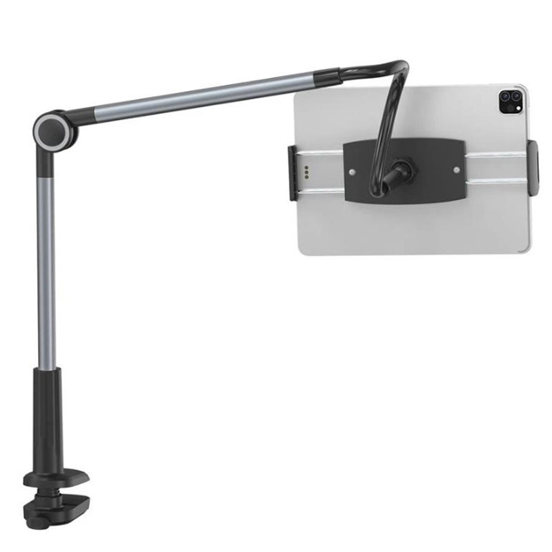 The stand features triple stability reinforcement. A strong clamp on the edges of the device protects it from falling, and the use of an extension spring extends the strength. The mounting element does not damage your furniture, so you can attach it to countertops with a thickness of up to 90 mm without worry.