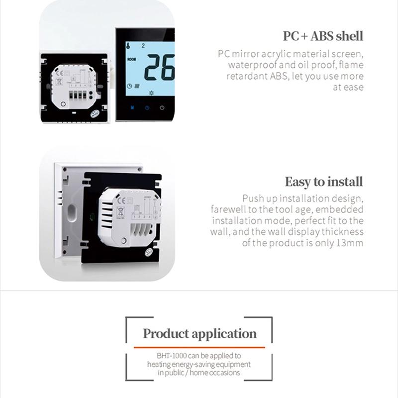 BHT-1000GB features a negative LCD display screen that remains easy to read in different lighting conditions. The capacitive touch keys provide smooth and intuitive control, making temperature adjustment quick and convenient. This combination of modern display technology and simple navigation makes the thermostat well suited for both private and professional environments.