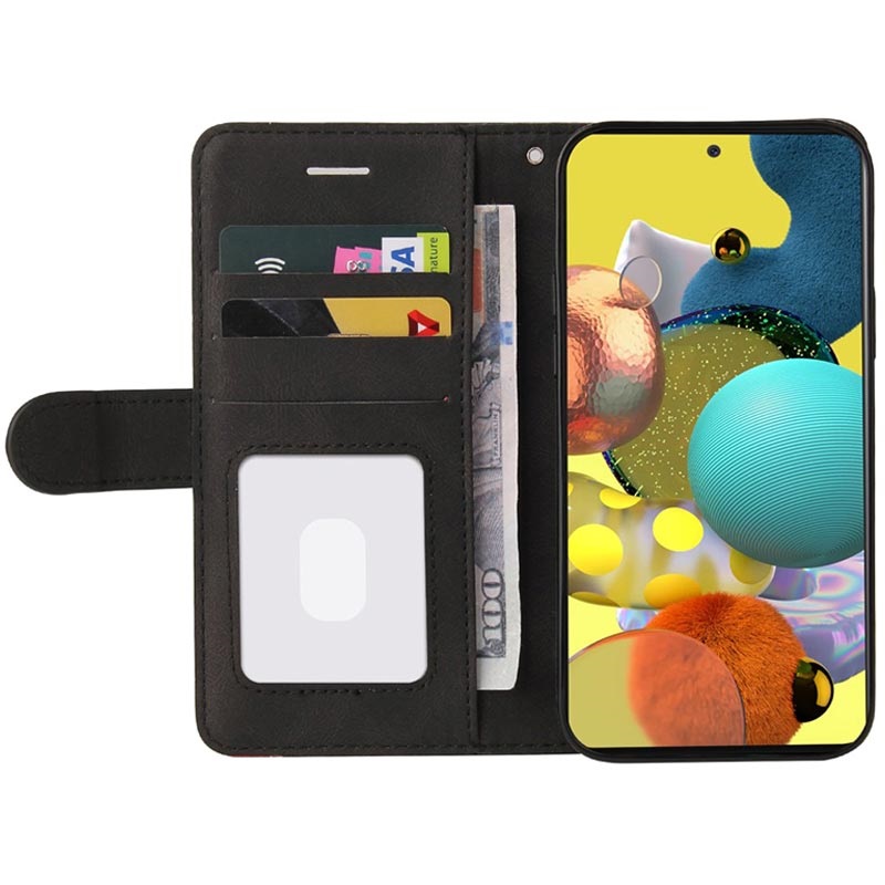 Wallet design provides storage for credit cards and cash, while your Samsung Galaxy A51 has all-around protection from wear and daily damage. A detachable lanyard offers additional security, and a foldable back enables hands-free video watching.