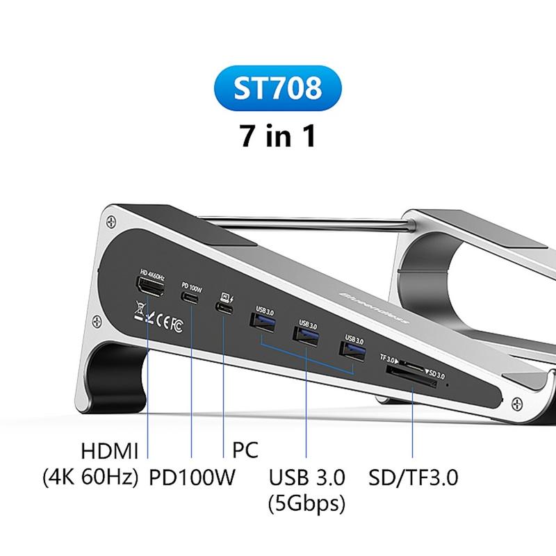 With support for 4K@60Hz video output and 100W Power Delivery pass-through charging, the ST708 keeps your laptop powered while extending your display to an external monitor. The aluminum alloy structure with stainless steel support tubes provides stability and durability, making it suitable for home offices, creative workstations, and travel setups.