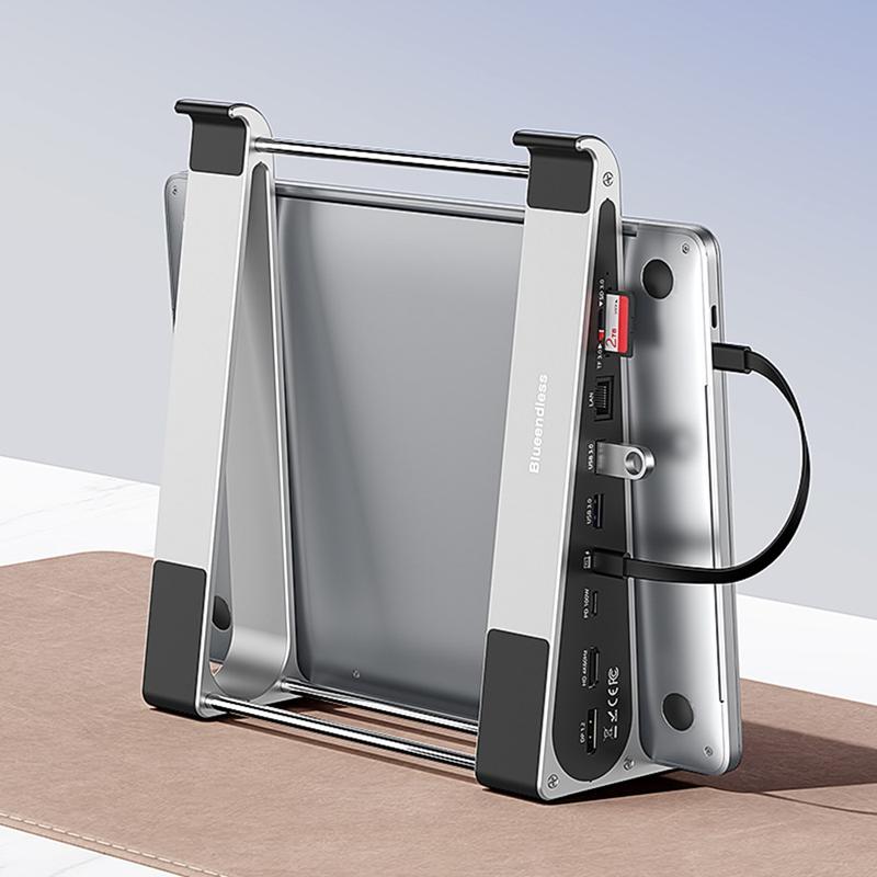 Upgrade your workspace with the Blueendless ST708 laptop stand with built-in USB-C hub. This multifunctional device combines a stable laptop riser with a 7-in-1 expansion hub, helping you improve ergonomics while expanding connectivity from a single USB-C port. The elevated design promotes better viewing angles and airflow, while the integrated ports allow you to connect monitors, storage devices, keyboards, and other accessories without clutter.