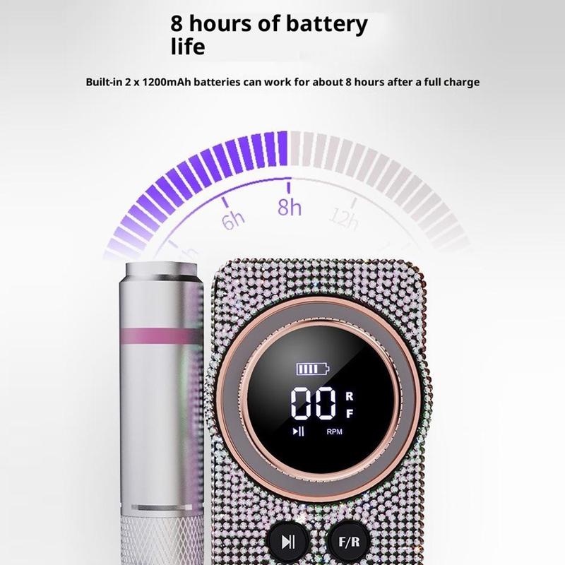With a high-speed motor reaching up to 35000 RPM, it delivers smooth and consistent operation for shaping, filing, refining, and general nail care. The LCD display makes it easy to monitor speed, battery level, rotation direction, and pause status, while the quick-lock handle allows simple drill bit changes without extra tools. Its rechargeable battery supports up to 8 hours of use, making it practical for longer sessions at home, in salons, or on the go.