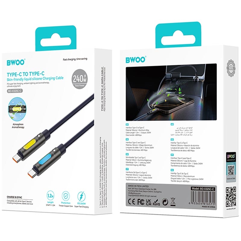 BWOO USB-C to USB-C Aromatherapy Charging Cable 240W 1.2m - RGB Light, Liquid Silicone, 480Mbps