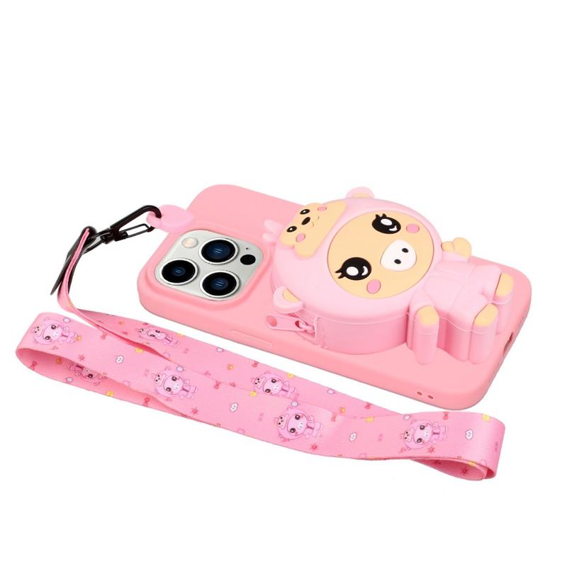For iPhone 14 Pro Max TPU Phone Case Cartoon Design Shockproof Cover Silicone Zippered Wallet Phone Case with Lanyard