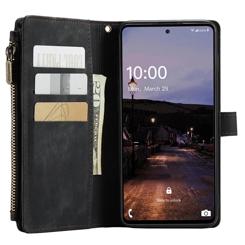 This multifunctional wallet case for Samsung Galaxy A33 5G will leave you speechless! Designed with ten card slots, one cash slot, and one zipper pocket - enough to carry your essentials everywhere you go! It's made of a quality polyurethane and inner TPU material, secured with magnetic closure. Also, it comes with a hand strap for more effortless wearing, and it can be used as a kickstand for enjoying watching videos hands-free.