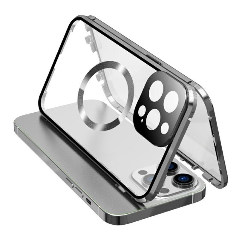Compatible with MagSafe Case for iPhone 15 Pro Magnetic Metal Frame + Double-Sided Tempered Glass Phone Cover with Buckle Lock - Silver