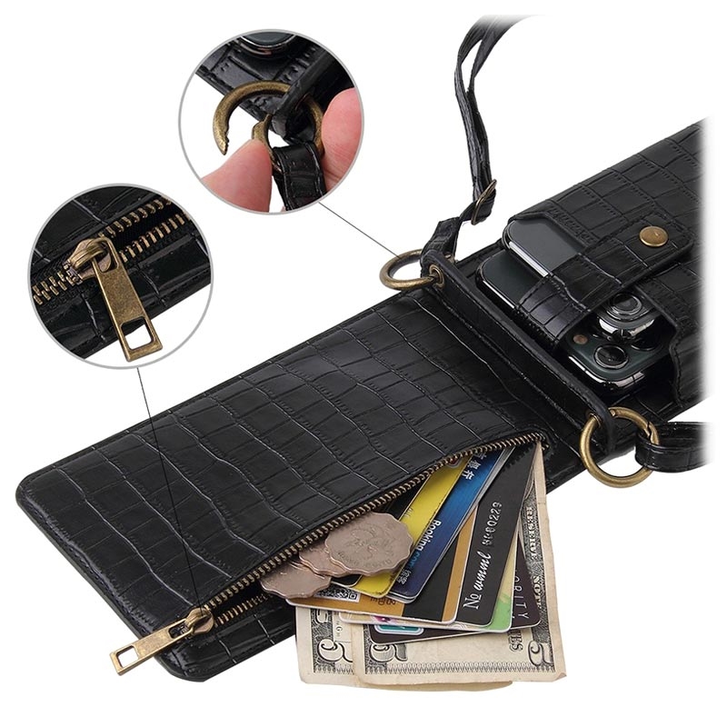 - Separate phone compartment, zipper pocket, and multiple card slots