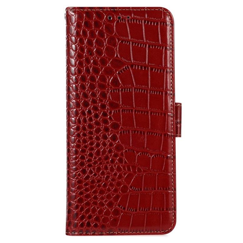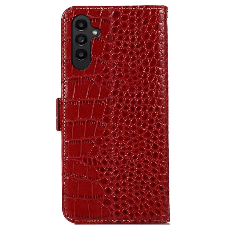 Style the look of your Samsung Galaxy A14 with this exceptional wallet leather case with a crocodile skin pattern. Equipped with several card slots, a cash compartment, and RFID-blocking technology, it will effectively replace your wallet. The magnetic clasp secures the case, and the clever design enables usage as a kickstand.