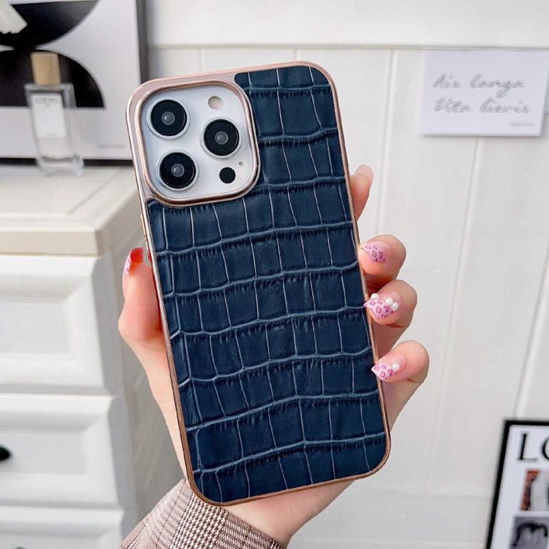 Cell Phone Case for iPhone 14 Pro Max, Crocodile Texture Genuine Leather+TPU Nano Electroplating Phone Back Cover