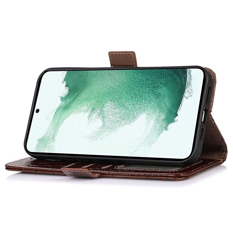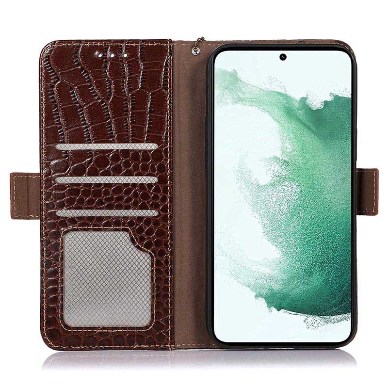 Keep all your credit cards, ID, and cash in the same place with your Samsung Galaxy A33 5G in this sublime Crocodile series wallet case with RFID blocking technology. The case contains a couple of card slots, an ID slot, and a money pocket. Thanks to the magnetic clasp enclosure, your valuables will be safe. The wallet case is made of high-quality cowhide and will protect your Samsung Galaxy A33 5G from daily damage.