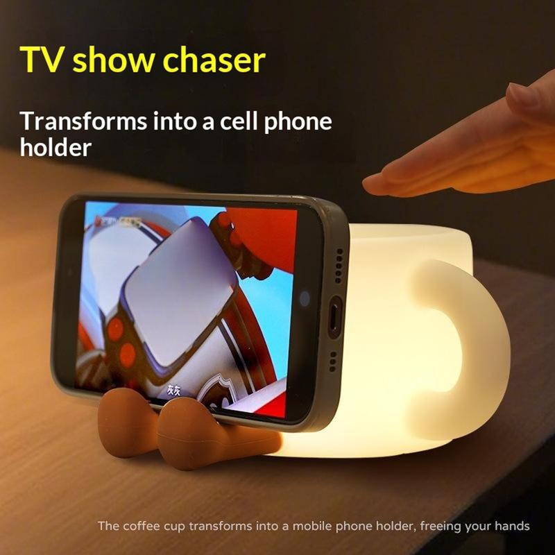 Cute Coffee Cup Night Light with Phone Stand - Tap Control 7-Colour LED Lamp, 3 Warm Brightness Levels, 30-Min Timer, USB-C Rechargeable