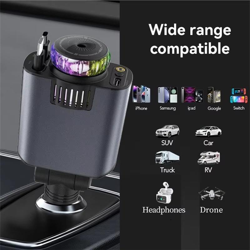- 5-in-1 versatility – fast charger, magnetic star-light projector, waterless aromatherapy diffuser, dual retractable cables and battery-health voltmeter in one compact device.