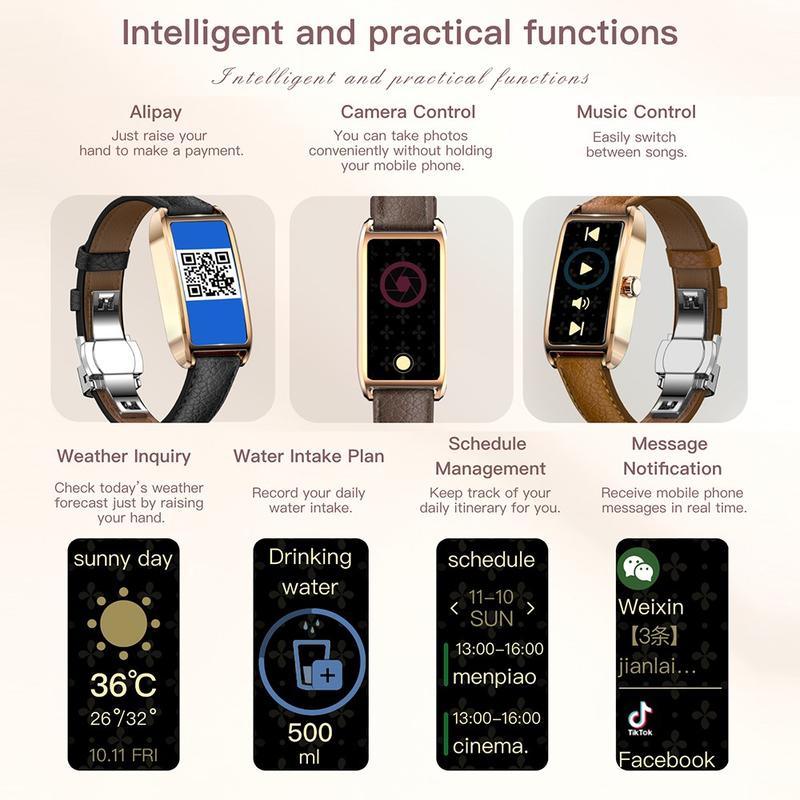 Stay organised and connected with a range of smart tools: Alipay support, music control, remote camera, vibration alerts, message notifications, weather updates, hydration reminders, and schedule management. Designed specifically for women, it also includes menstrual-cycle tracking and night-mode display dimming for restful evenings.