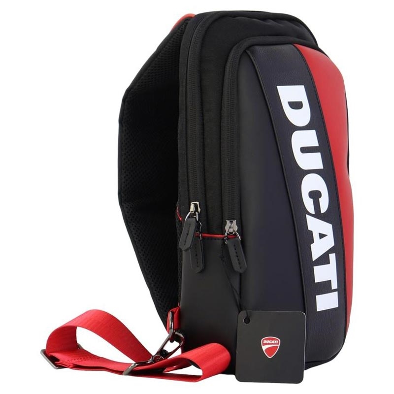 - Sporty Ducati sling bag design with bold logo and colour scheme