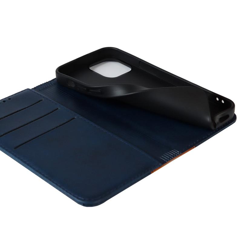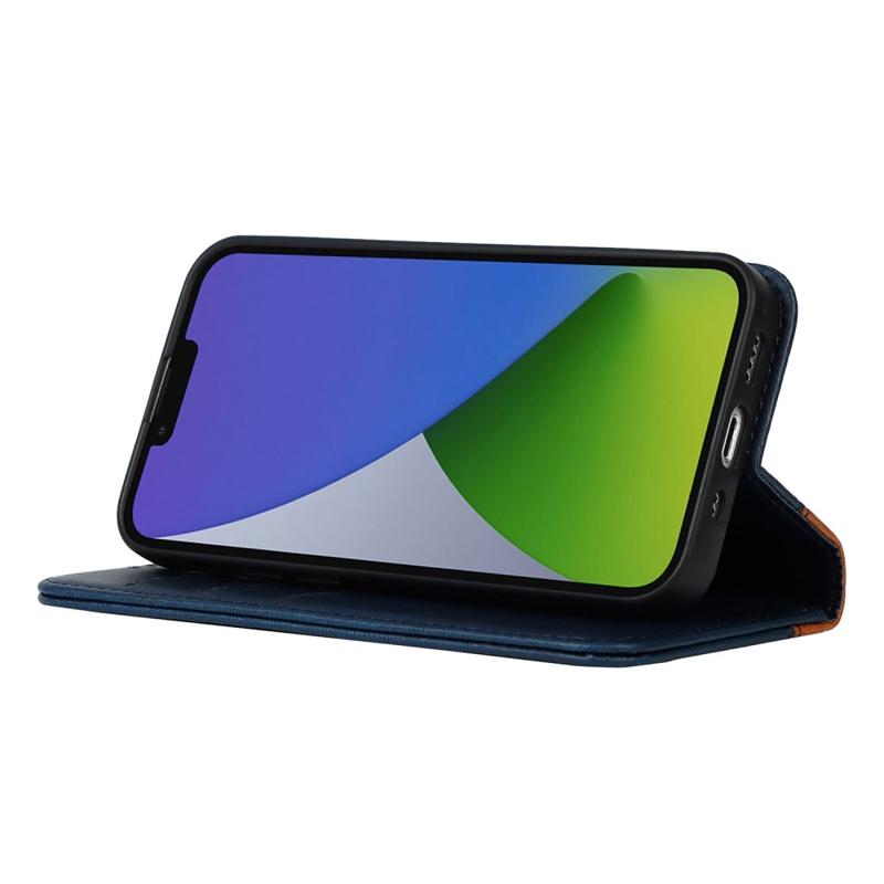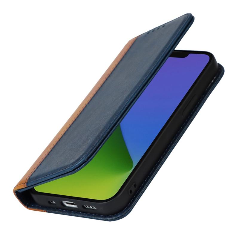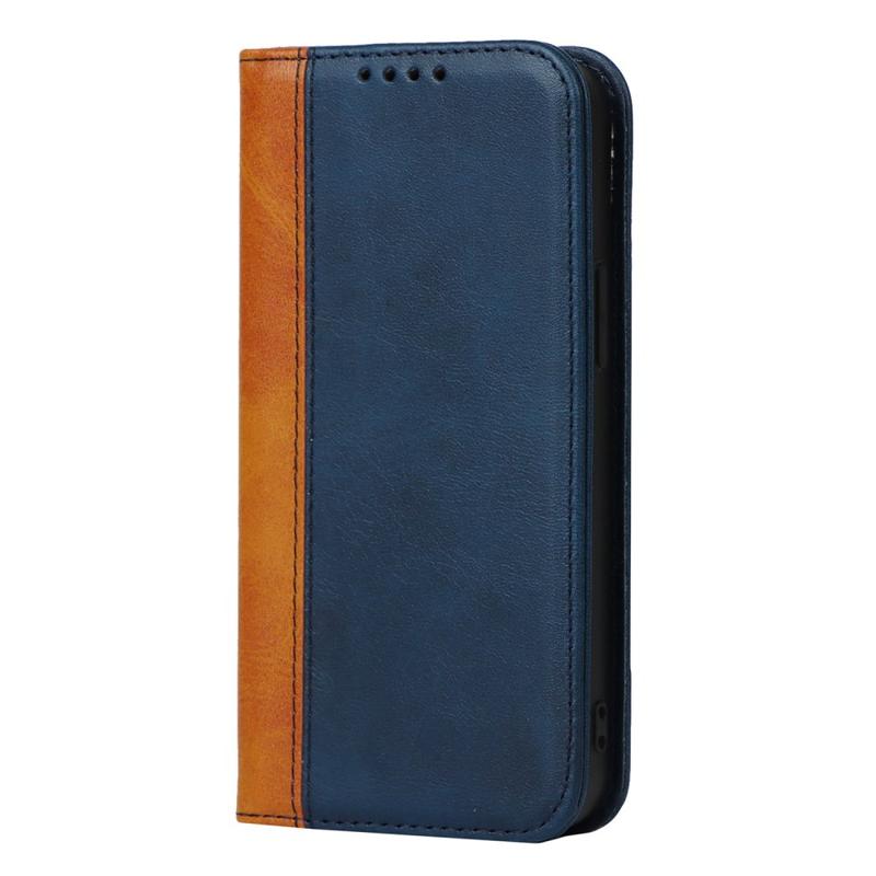 For iPhone 14 Bi-color Splicing Magnetic Auto-absorbed Calf Texture PU Leather Phone Case Drop-proof Wallet Stand Cover