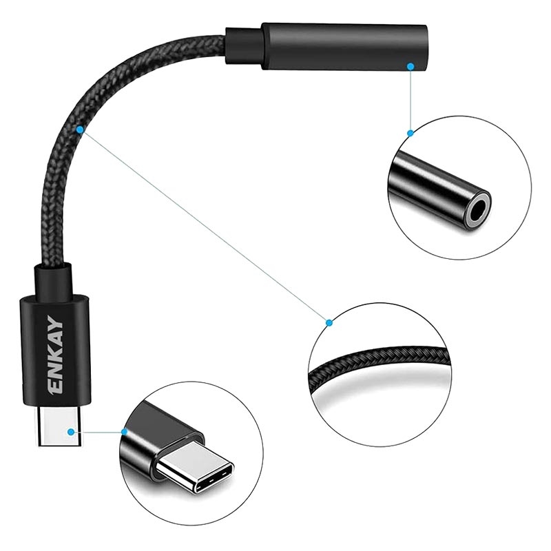 This Enkay adapter enables connection between a USB-C port and a 3.5mm AUX audio cable. It provides stable transmission and allows you answering on phone calls with your headphones.