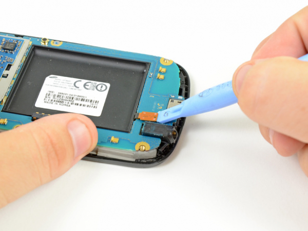 Lift the battery from the end closest to the headphone jack using the edge of a plastic opening tool.