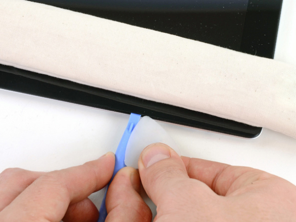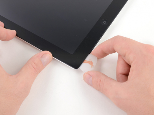 Using one of the guitar picks, pry up the bottom right corner of the iPad and grab it with your fingers.