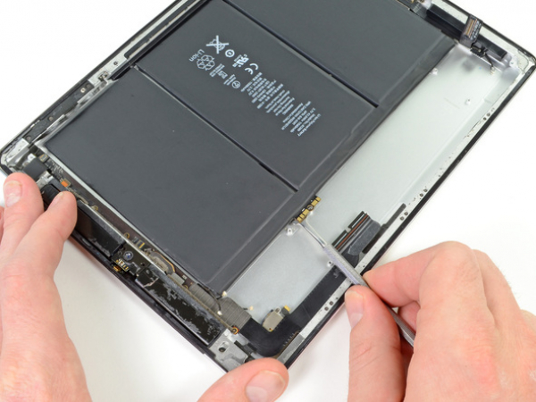 Peel back the digitizer ribbon cable. Separate the cable from the adhesive securing it to the rear aluminum case with the flat end of a spudger.