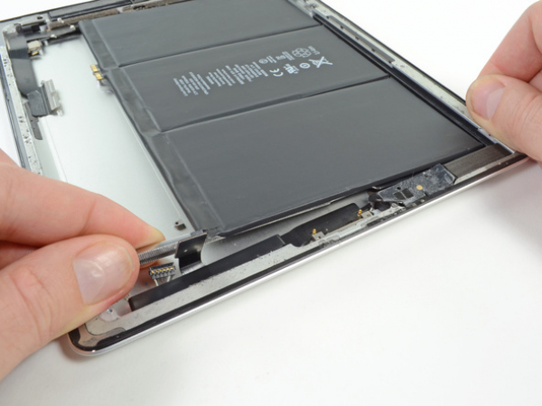 Take the digitizer ribbon cable out of its niche in the aluminum frame. Do this with your fingers.