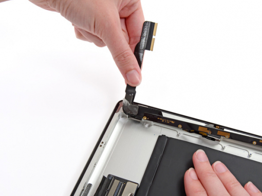 Peel back the digitizer ribbon cable. Separate the cable from the adhesive securing it to the rear aluminum case with the flat end of a spudger.
