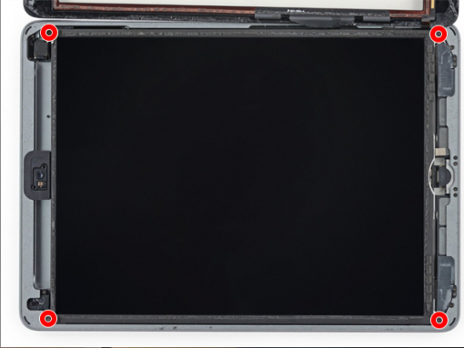 - Work your way around the perimeter of the iPad, scraping the rest of the adhesive tape or broken glass. - Prepare the new screen for installation. - Remove the plastic protection from the inner perimeter of the screen. - Reinstall the home button flex cable and bracket. - Reinstall the camera bracket. - Install the pre-cut adhesive strips around the inner perimeter of the iPad. - Plug in the digitizer cables. - Reinstall the screws that are holding the metal plate. - Tuck the screw corners underneath the adhesive. - Insert the four screws into each corner. - Peel off the paper backing of the double-sided adhesive strips. - Peel off the plastic protector. - Gently place the screen until all the sides of the screen are flush.