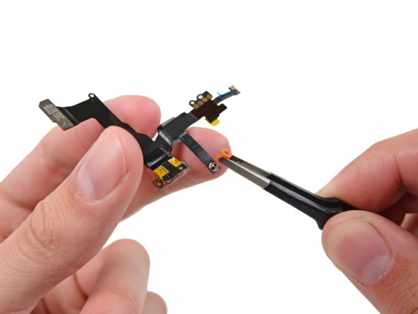 Pry the earpiece speaker contact cable gently up in order to separate this part of the camera and the sensor cable from the adhesive. Do this either with a metal spudger or with the edge of a pair of tweezers.